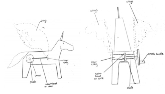 We were also tasked to find out how to make the wings move without directly touching the wings. To accomplish this, we first connected the wings on the inside of the unicorn to the inner part of the crank using a rubber band, as seen in the illustration below. We would then connect it to a shaft which in turn is connected to the handle outside of the unicorn’s body, giving us the ability to flap the wings by turning the handle.